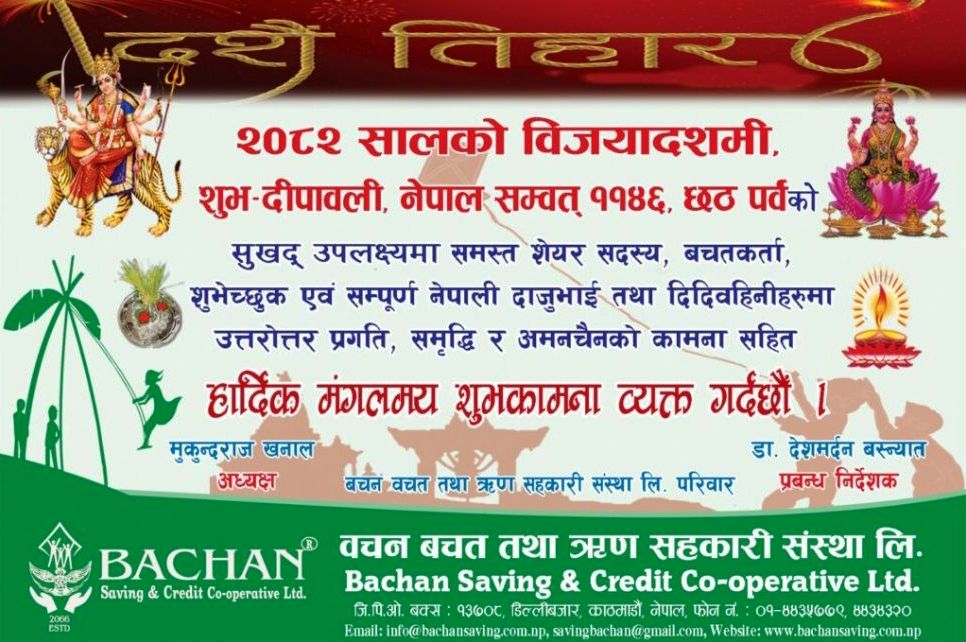 Bachan Saving and Credit Co-operative (SACCOS) Ltd. is a primary Cooperative registered in 2008 at the Division Cooperative Office, Government of Nepal under the Co-operative Act, 1992. The philosophy of this organization is that owners and beneficiaries are the same on the basis of democratic practice; membership is voluntary, persuading empathy, mutual respect, self-help, and one member one vote. The Cooperative was founded for the purpose of helping small entrepreneurs and uplifting the socio-economic growth at the micro-level of its affiliated members to fight against poverty, economic & social crisis, and natural disasters.