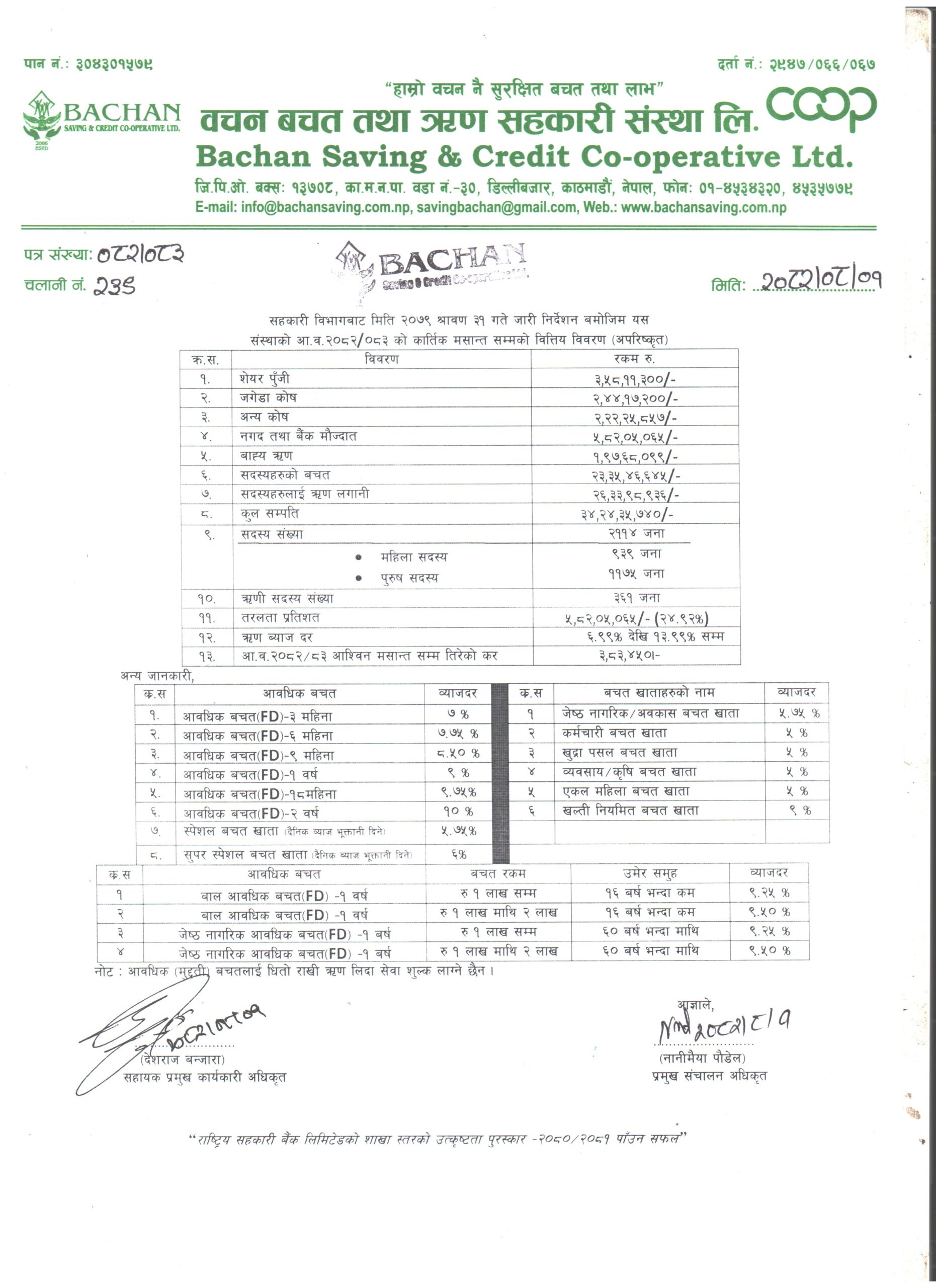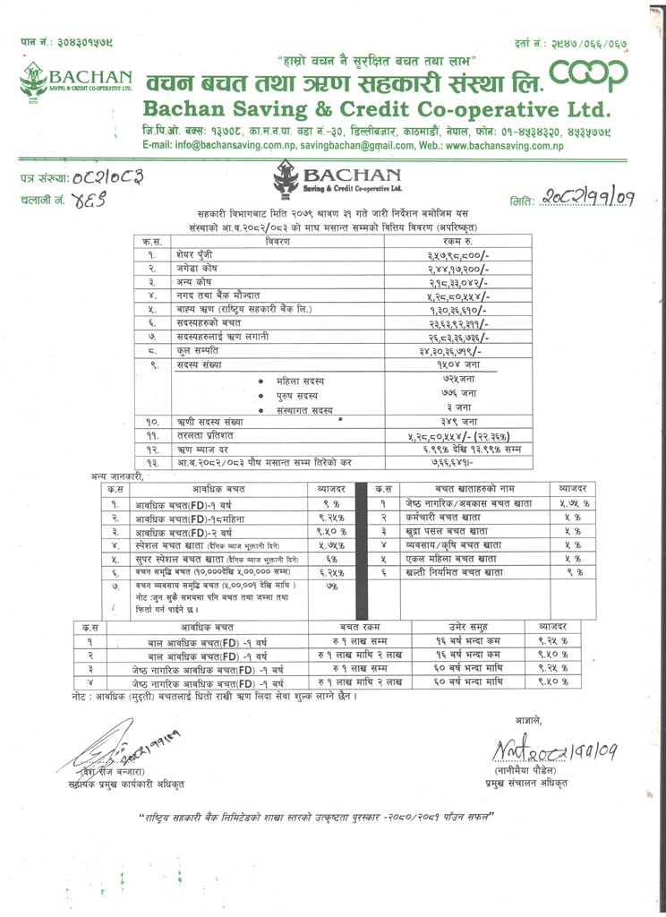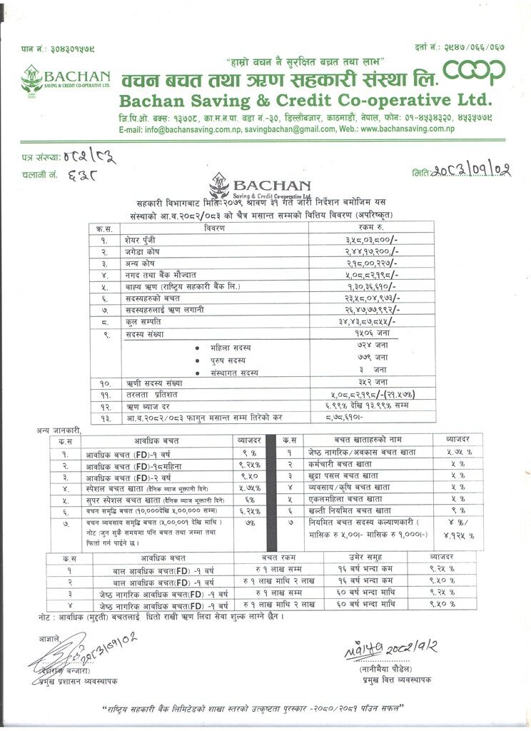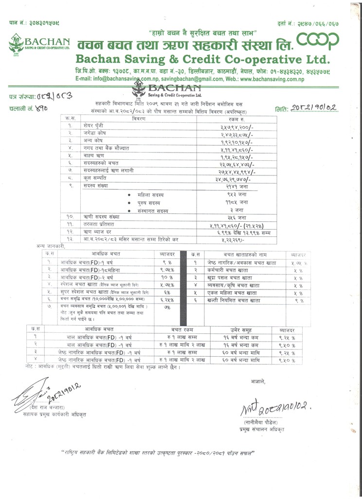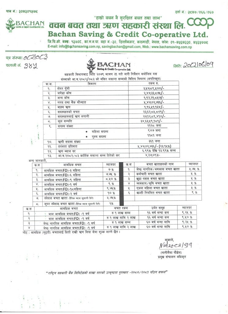 Bachan Saving and Credit Co-operative (SACCOS) Ltd. is a primary Cooperative registered in 2008 at the Division Cooperative Office, Government of Nepal under the Co-operative Act, 1992. The philosophy of this organization is that owners and beneficiaries are the same on the basis of democratic practice; membership is voluntary, persuading empathy, mutual respect, self-help, and one member one vote.