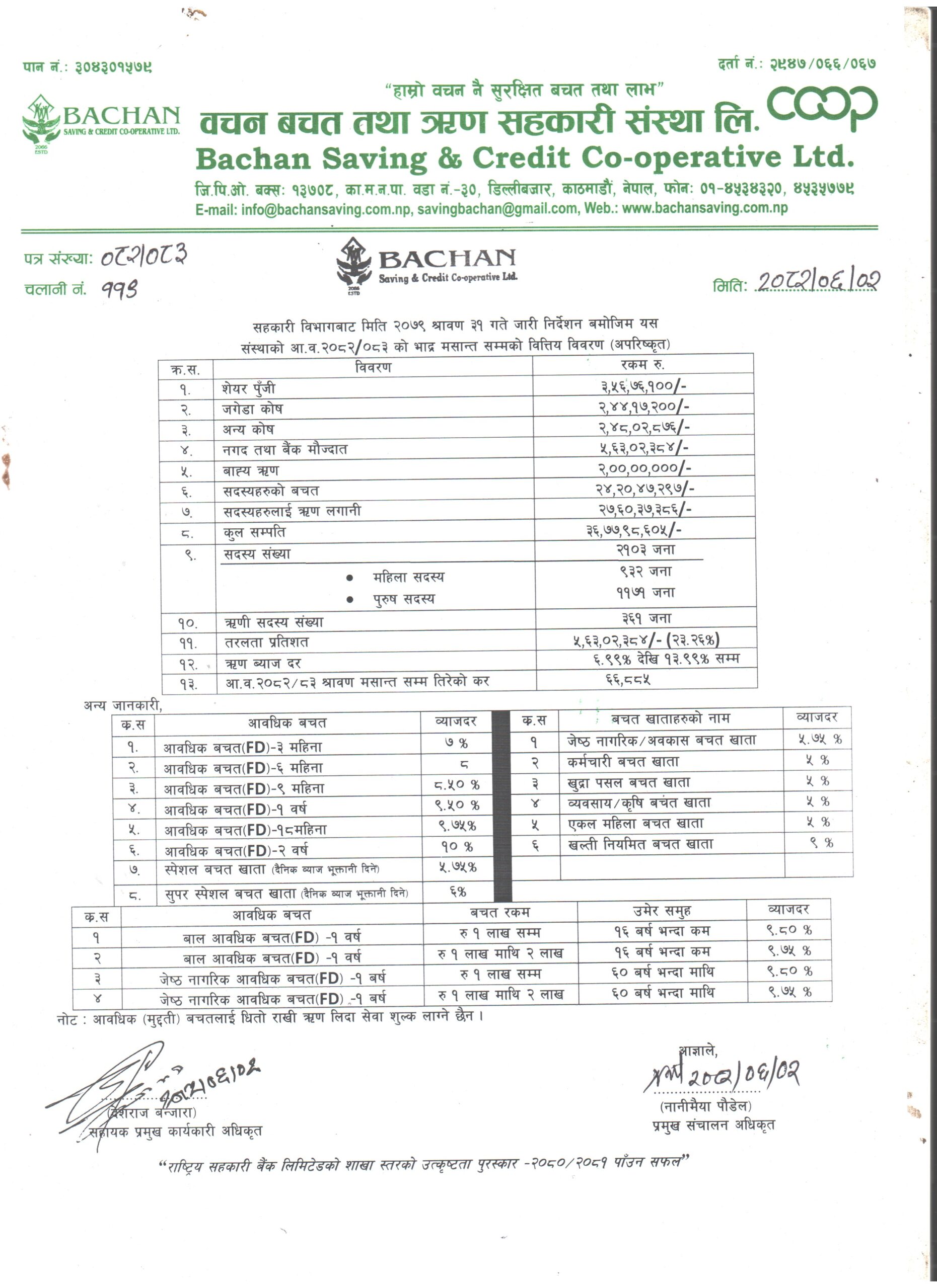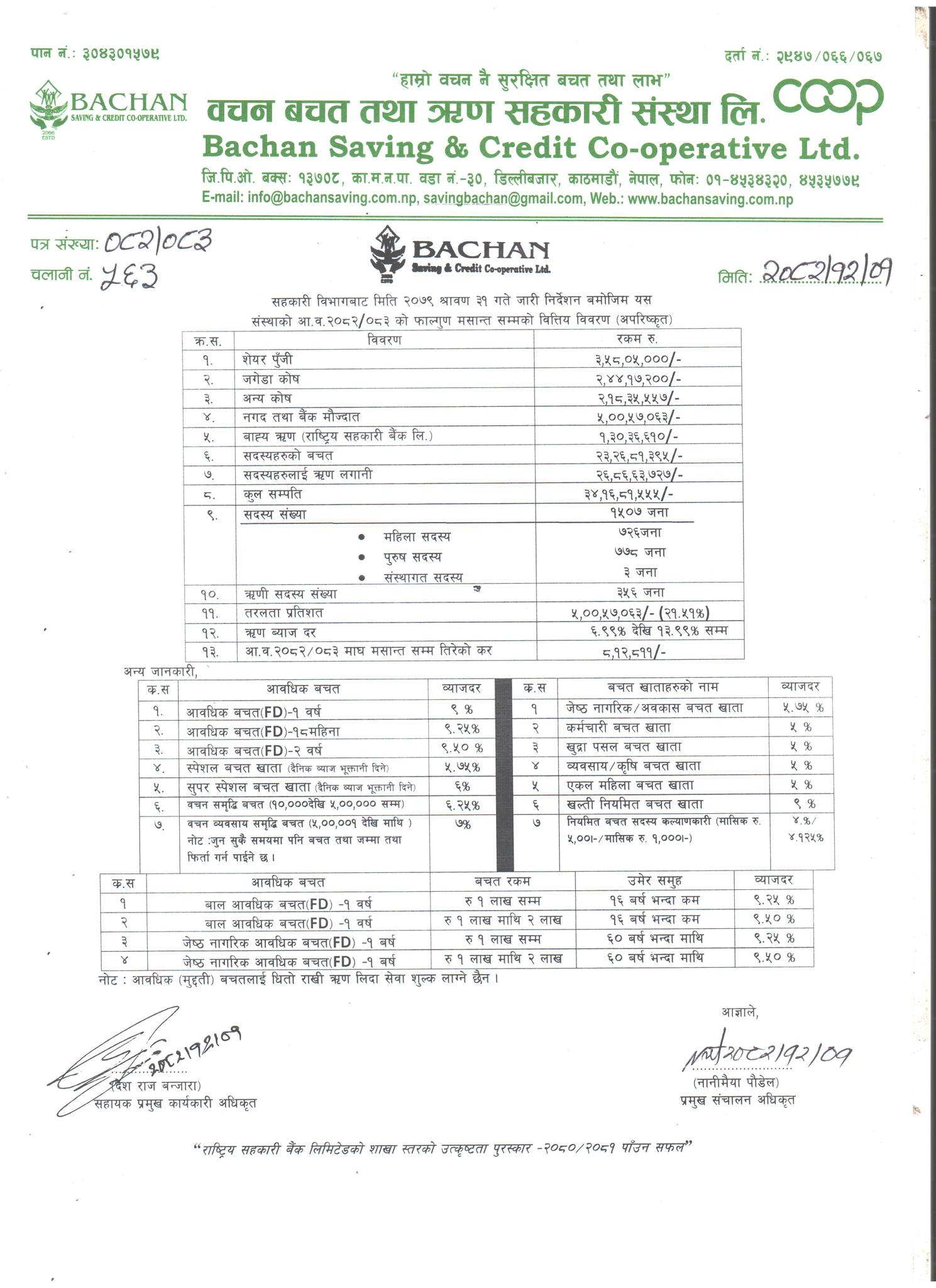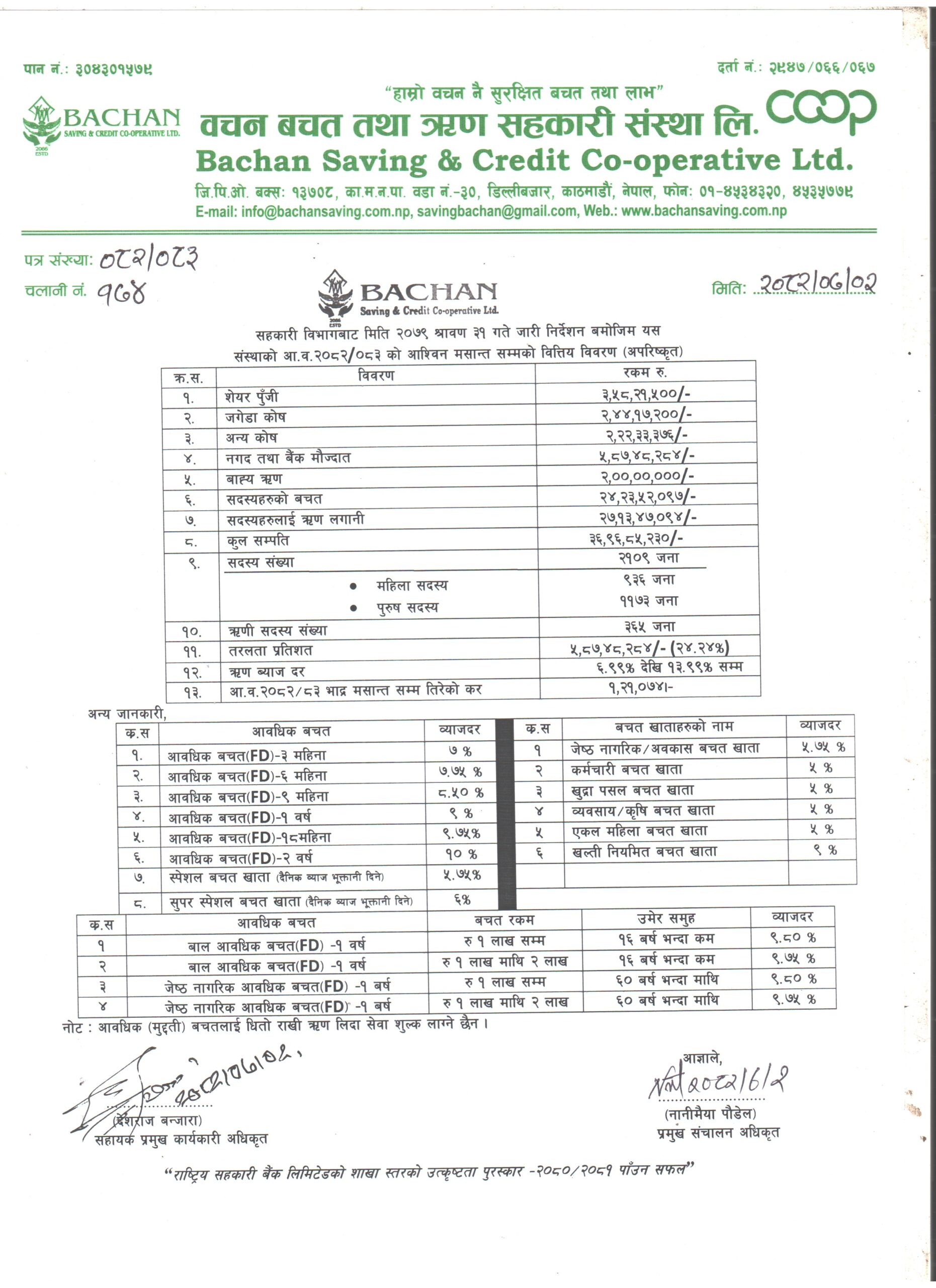 Bachan Saving and Credit Co-operative (SACCOS) Ltd. is a primary Cooperative registered in 2008 at the Division Cooperative Office, Government of Nepal under the Co-operative Act, 1992. The philosophy of this organization is that owners and beneficiaries are the same on the basis of democratic practice; membership is voluntary, persuading empathy, mutual respect, self-help, and one member one vote.